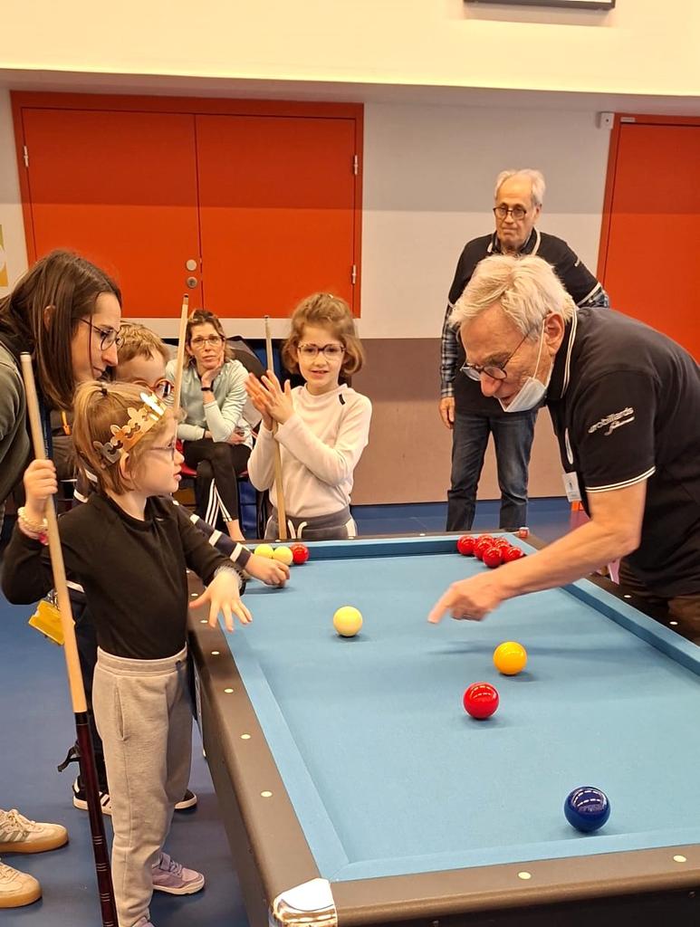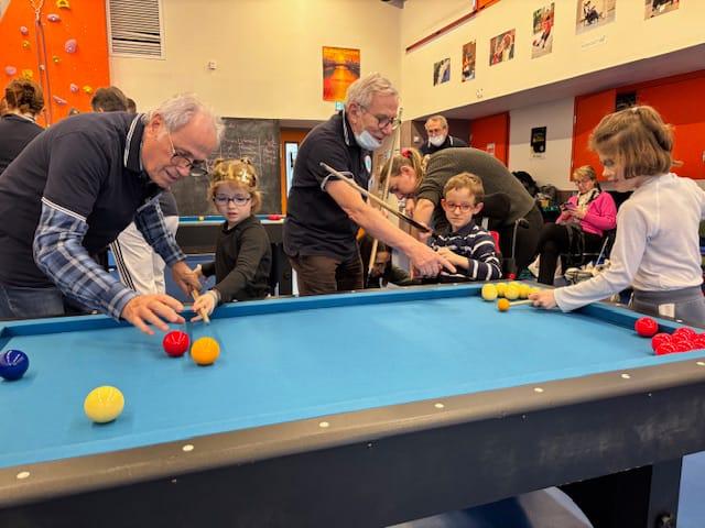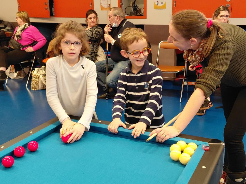 Nos jeunes champions en herbe, âgés de 5 à 15 ans, ont pu s’évader en découvrant différentes façons de jouer : initiation à la carambole, parties de billard pétanque, avec une queue de billard ou simplement « à la main » en faisant rouler les billes sur le tapis. Concentration, rires, petites victoires et complicité ont rythmé cette rencontre, créant une atmosphère lumineuse au cœur du parcours de soins. Les plus grands se sont même prêtés au jeu des matchs de billard pétanque, où l’art de caramboler les bandes pour se rapprocher du cochonnet a suscité de beaux moments d’enthousiasme. Ces tentatives pleines d’adresse ont fait naître de jolis sourires sur leurs visages.